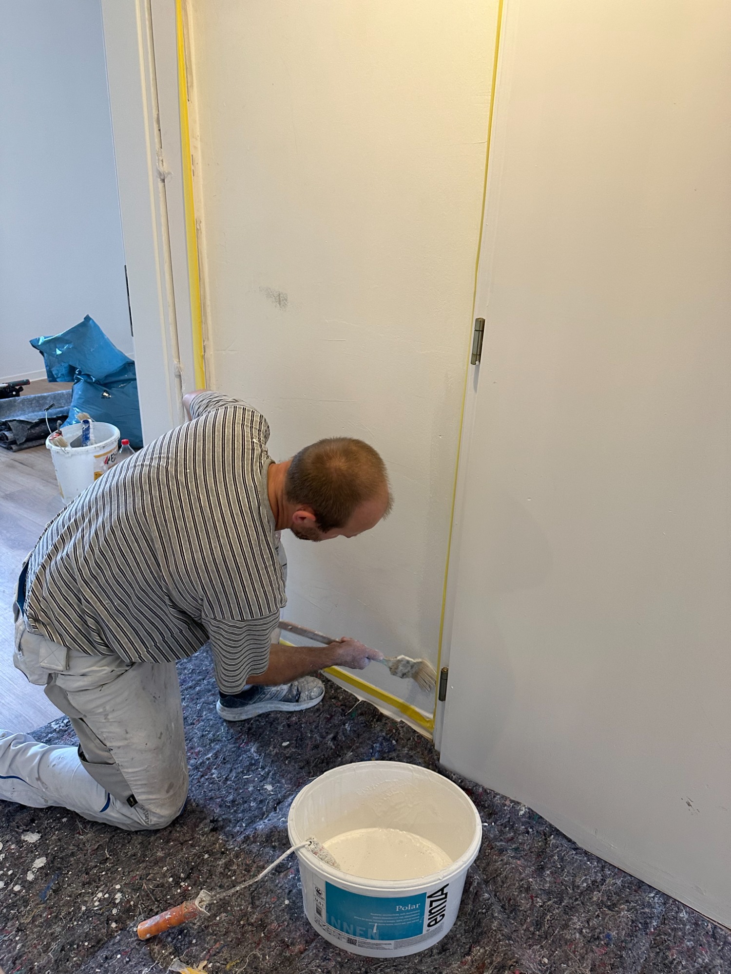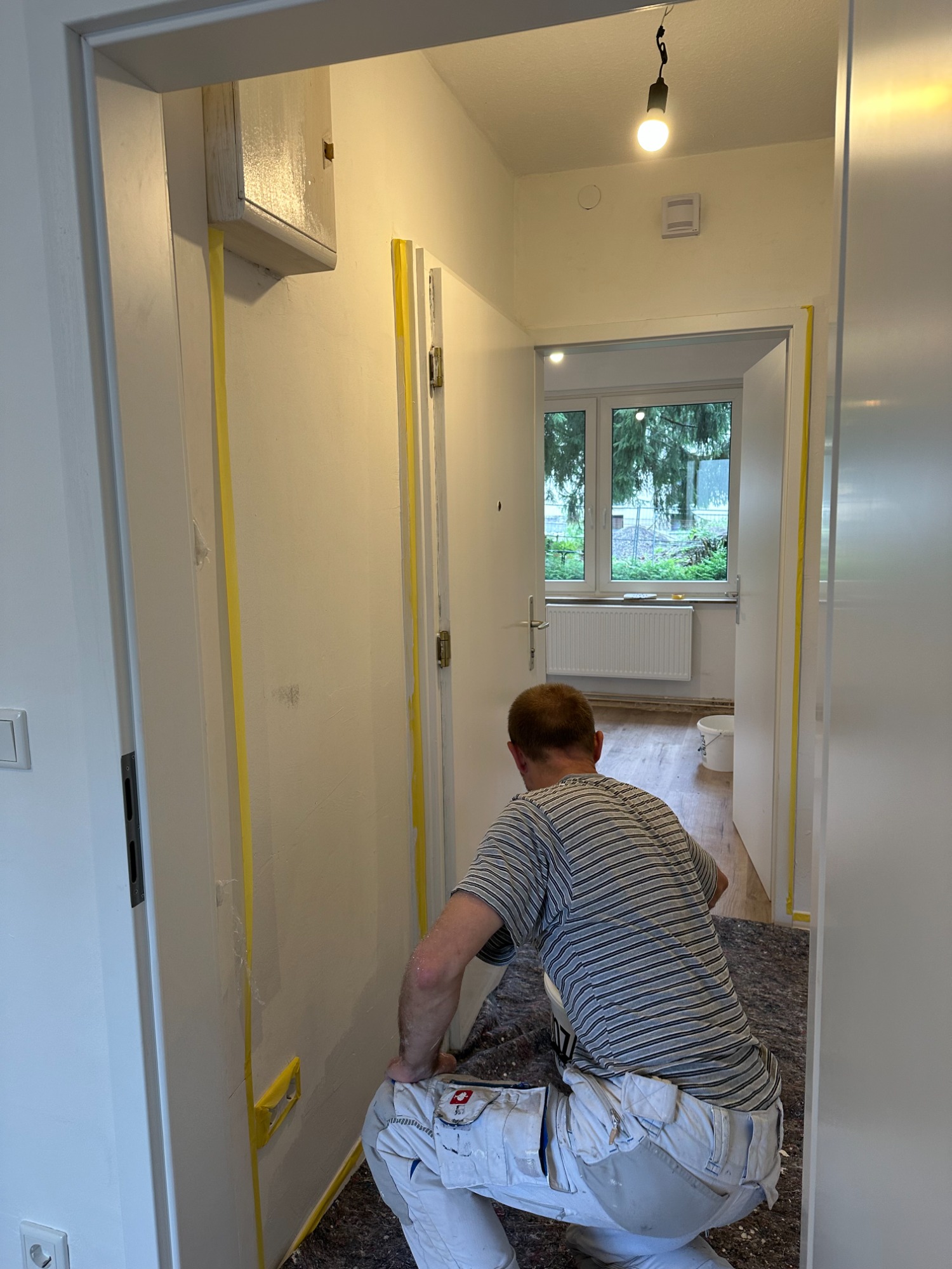 Wie Sie sehen, legen wir größten Wert auf eine sorgfältige Vorbereitung: Vom akkuraten Abkleben jeder Kante und Leiste bis zur vollständigen Abdeckung Ihrer Böden. Nur so garantieren wir Ihnen saubere Linien, einen makellosen Farbauftrag und den Schutz Ihres Eigentums.